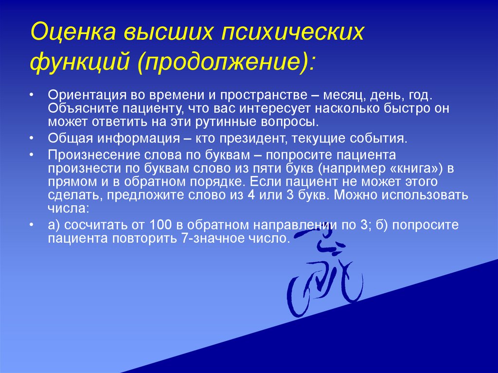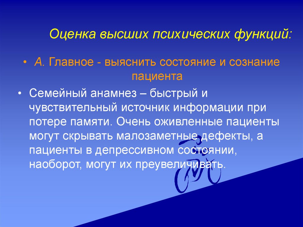 Оценка высших психических функций:• А. Главное - выяснить состояние и сознание