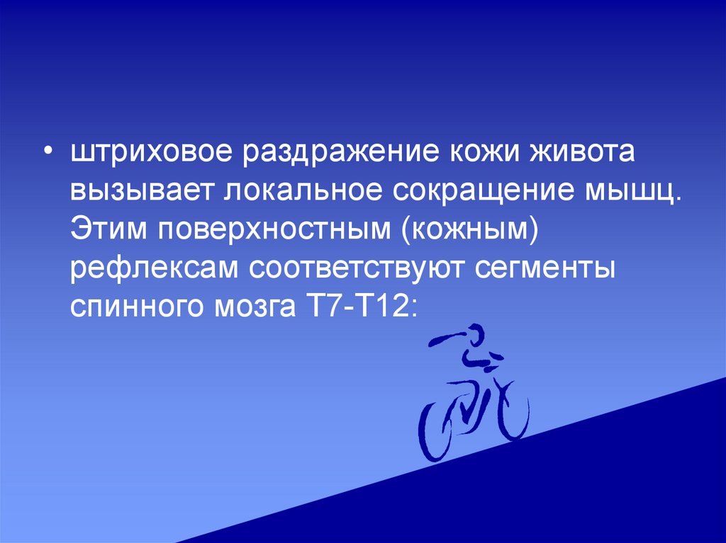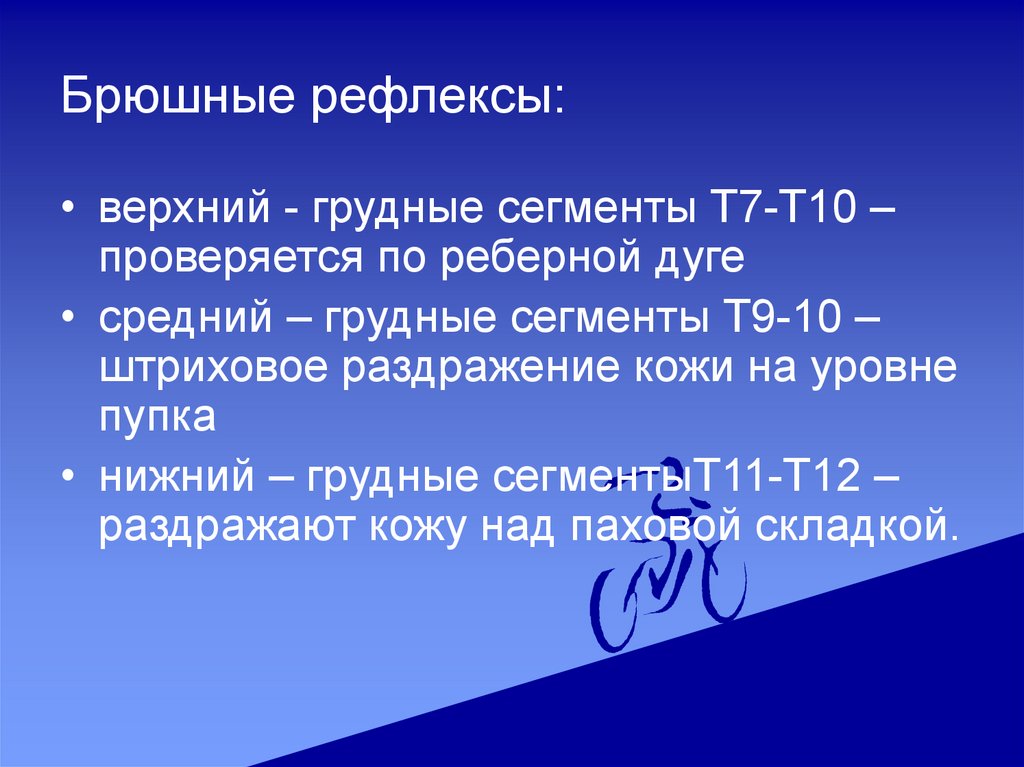 Брюшные рефлексы:• верхний - грудные сегменты Т7-Т10 –