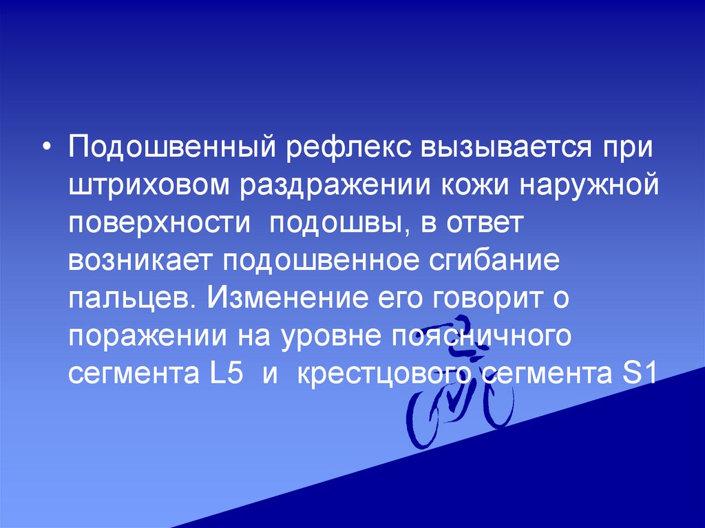 • Подошвенный рефлекс вызывается приштриховом раздражении кожи наружной