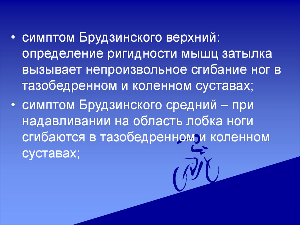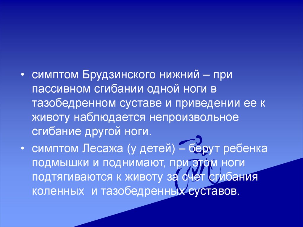 • симптом Брудзинского нижний – припассивном сгибании одной ноги в