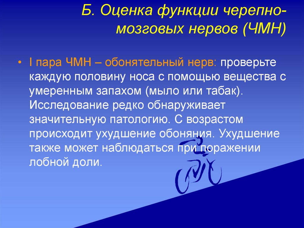 Б. Оценка функции черепномозговых нервов (ЧМН)• I пара ЧМН – обонятельный нерв: проверьте