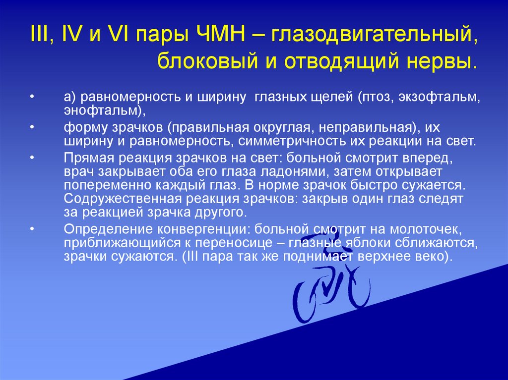 III, IV и VI пары ЧМН – глазодвигательный,блоковый и отводящий нервы.