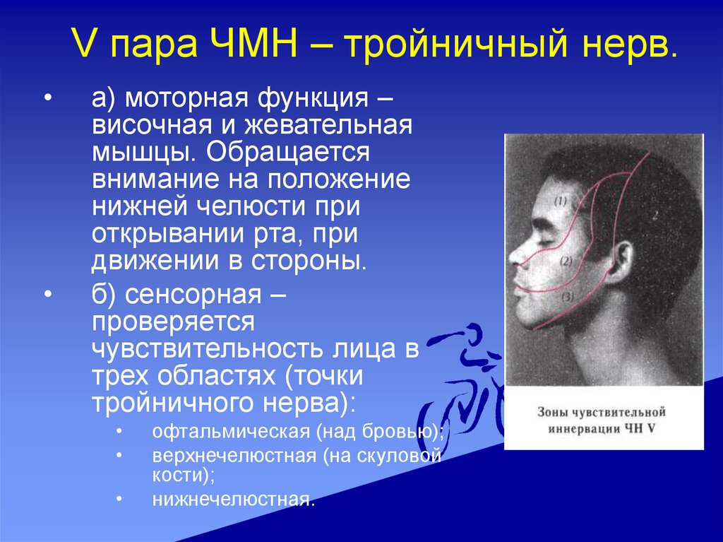 V пара ЧМН – тройничный нерв.а) моторная функция –