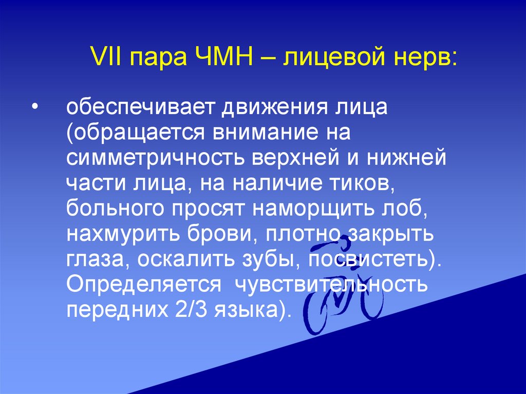 VII пара ЧМН – лицевой нерв:обеспечивает движения лица