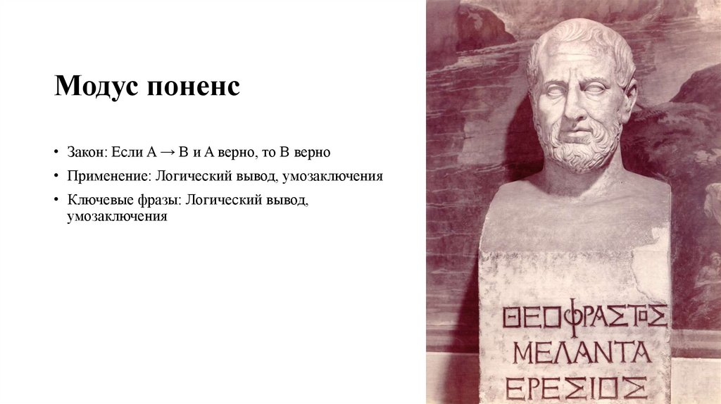 Модус поненс• Закон: Если A → B и A верно, то B верно