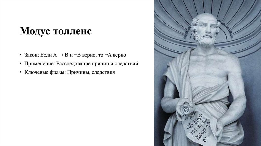 Модус толленс• Закон: Если A → B и ¬B верно, то ¬A верно