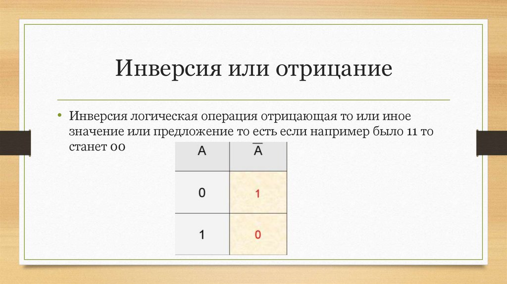 Инверсия или отрицание• Инверсия логическая операция отрицающая то или иное