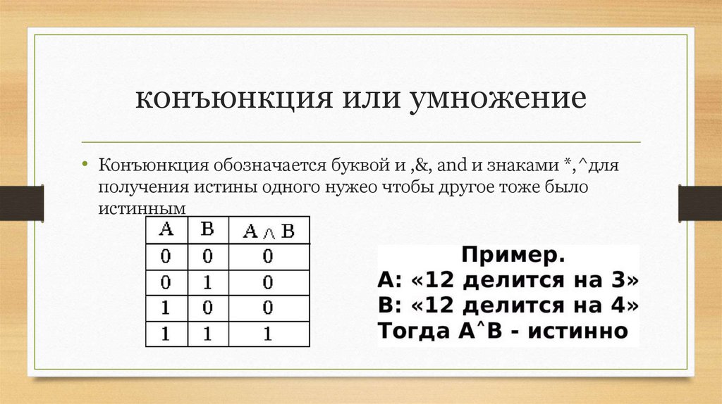 конъюнкция или умножение• Конъюнкция обозначается буквой и ,&, and и знаками *,^для