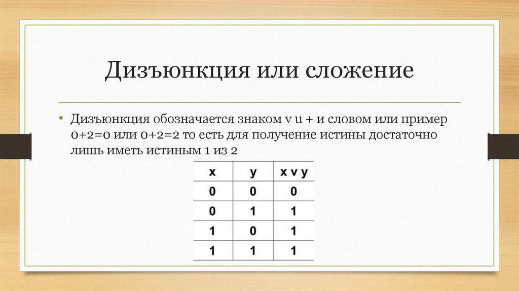 Дизъюнкция или сложение• Дизъюнкция обозначается знаком v u + и словом или пример