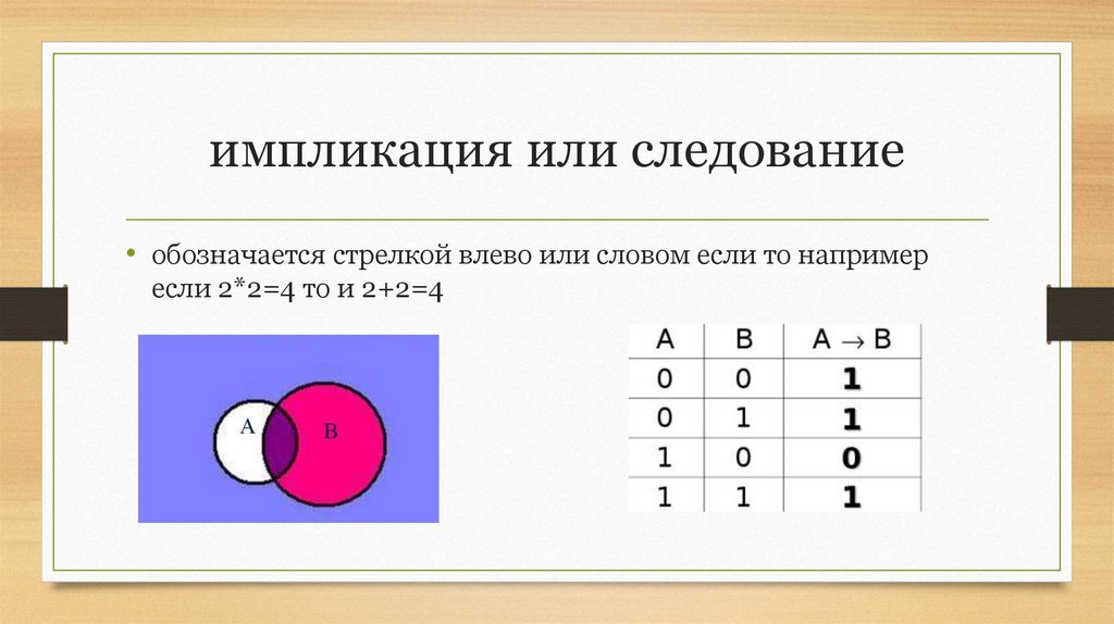 импликация или следование• обозначается стрелкой влево или словом если то например