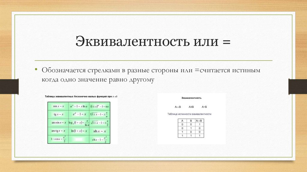Эквивалентность или =• Обозначается стрелками в разные стороны или =считается истиным
