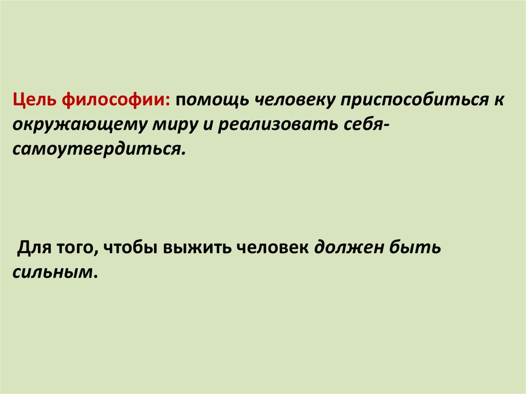 Цель философии: помощь человеку приспособиться кокружающему миру и реализовать себясамоутвердиться.