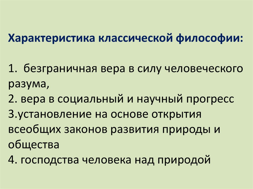 Характеристика классической философии:1. безграничная вера в силу человеческого