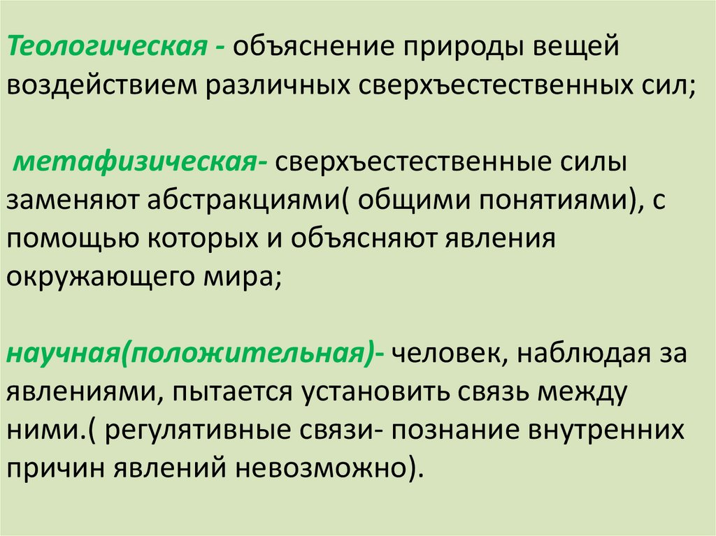 Теологическая - объяснение природы вещейвоздействием различных сверхъестественных сил;