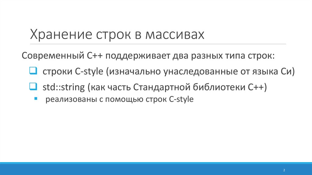 Хранение строк в массивахСовременный C++ поддерживает два разных типа строк: