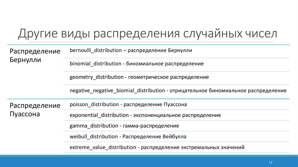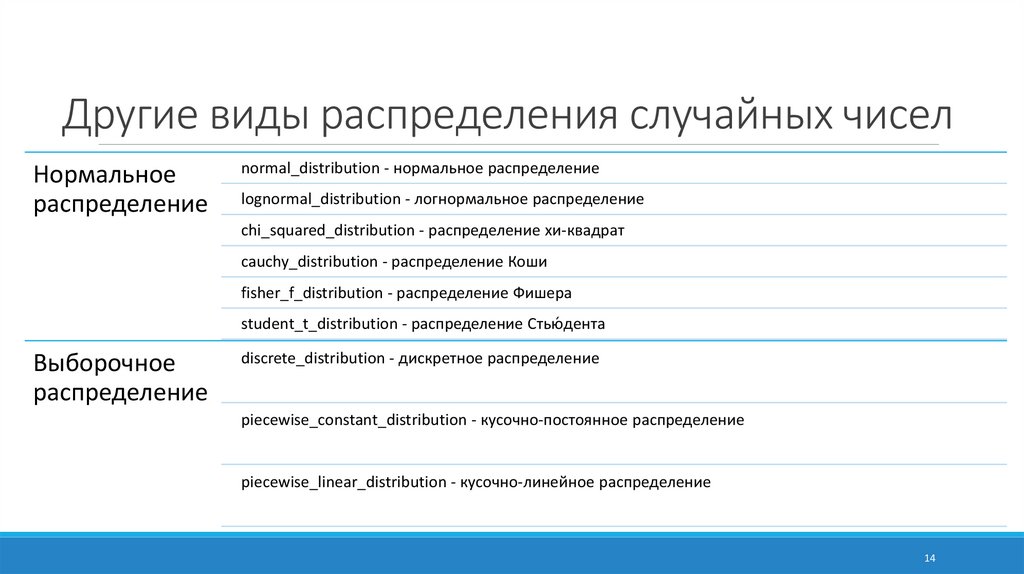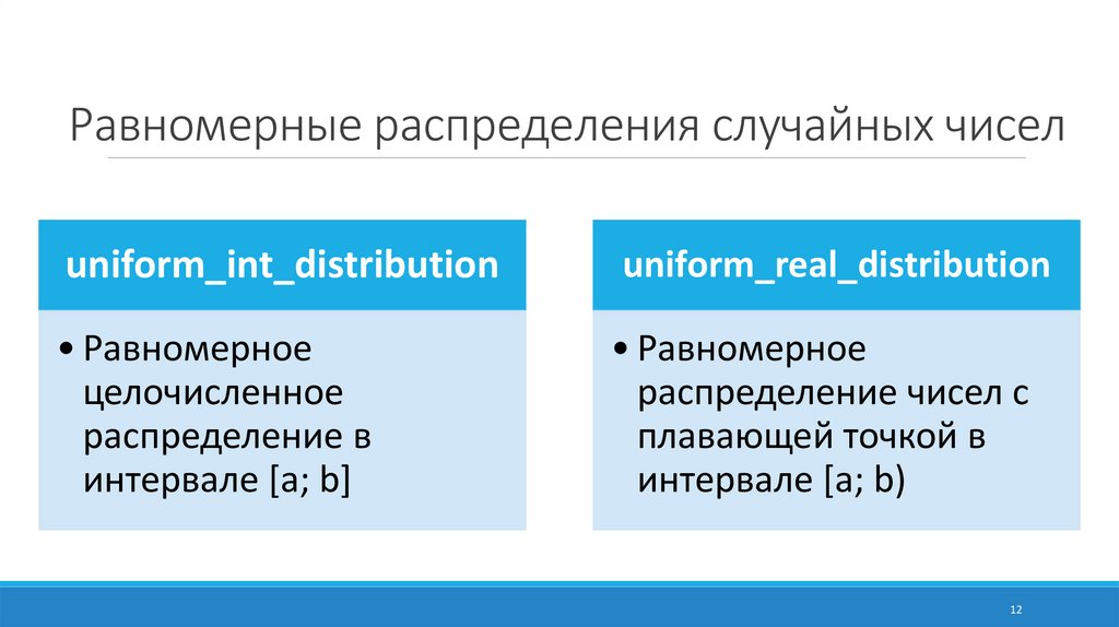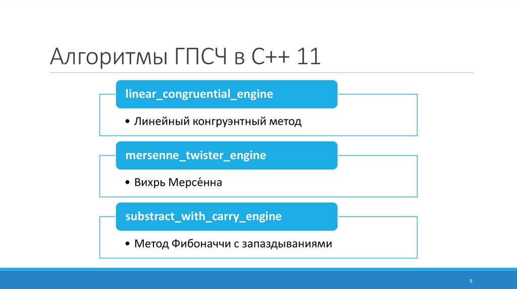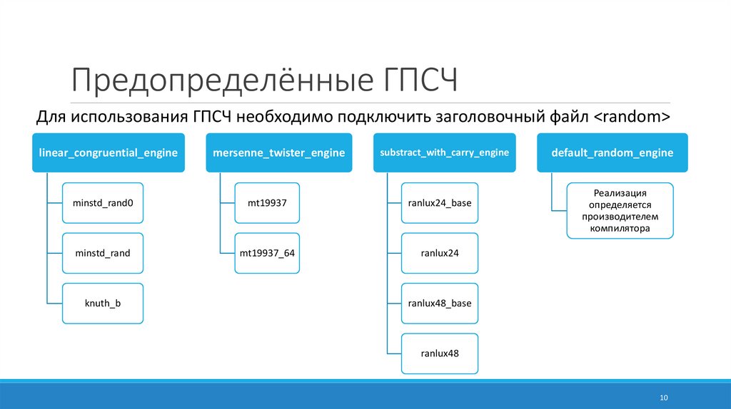 Предопределённые ГПСЧДля использования ГПСЧ необходимо подключить заголовочный файл <random>