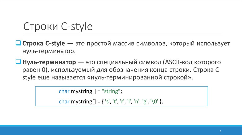 равен 0), используемый для обозначения конца строки. Строка Cstyle еще называется «нуль-терминированной строкой».