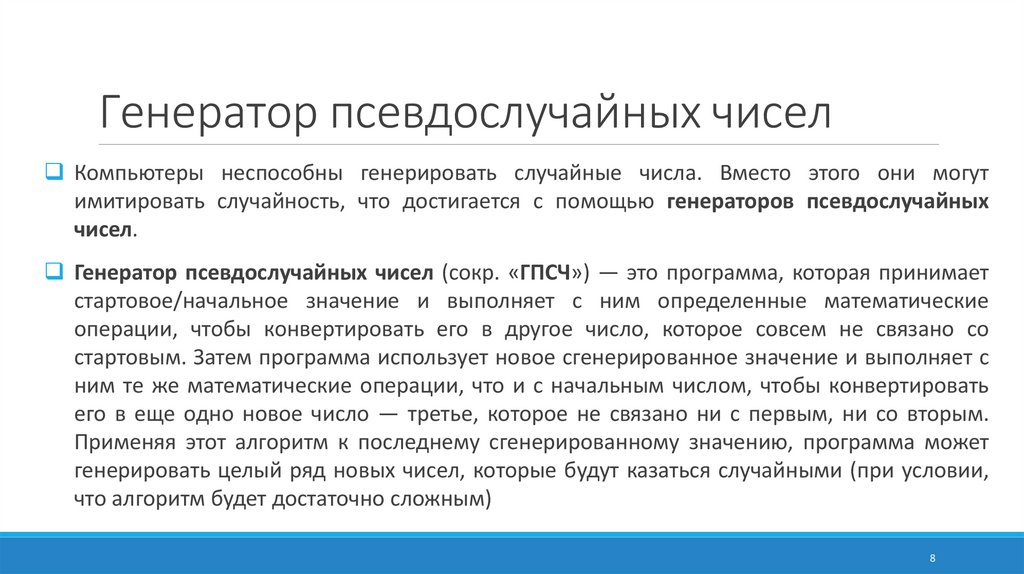 генерировать целый ряд новых чисел, которые будут казаться случайными (при условии,