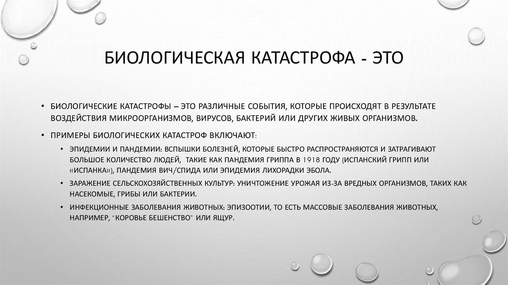 БИОЛОГИЧЕСКАЯ КАТАСТРОФА - ЭТО• БИОЛОГИЧЕСКИЕ КАТАСТРОФЫ – ЭТО РАЗЛИЧНЫЕ СОБЫТИЯ, КОТОРЫЕ ПРОИСХОДЯТ В РЕЗУЛЬТАТЕ