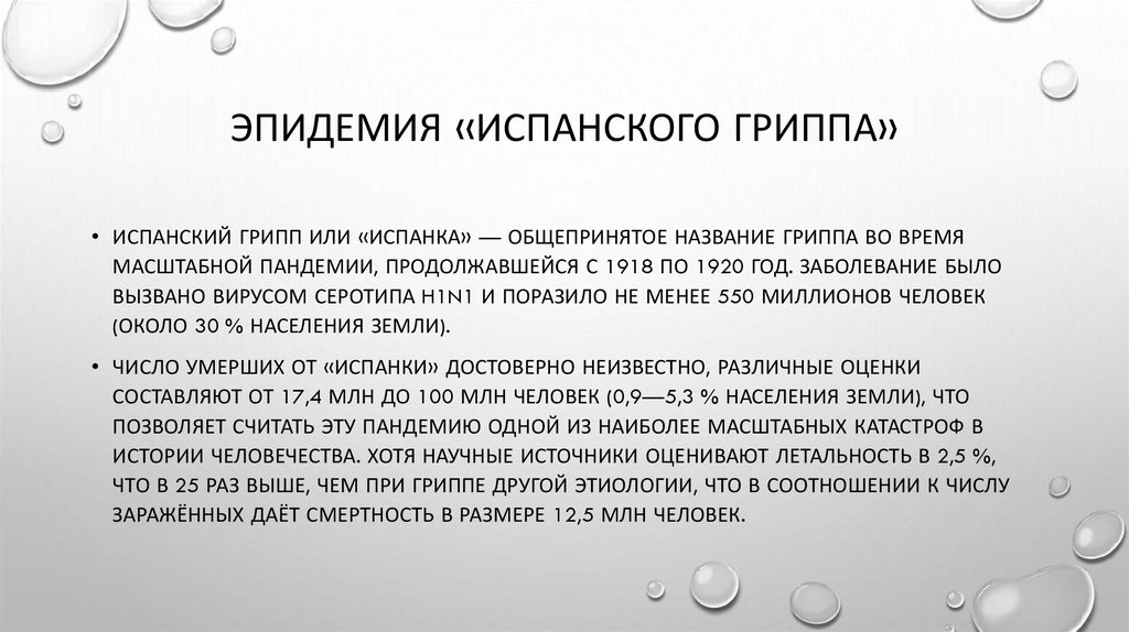 ЭПИДЕМИЯ «ИСПАНСКОГО ГРИППА»• ИСПАНСКИЙ ГРИПП ИЛИ «ИСПАНКА» — ОБЩЕПРИНЯТОЕ НАЗВАНИЕ ГРИППА ВО ВРЕМЯ