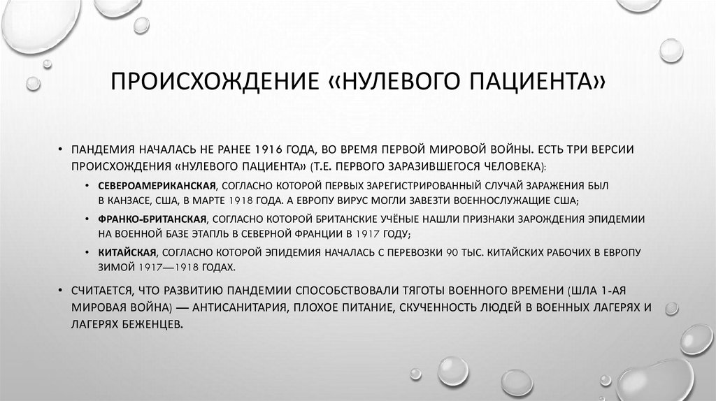 ПРОИСХОЖДЕНИЕ «НУЛЕВОГО ПАЦИЕНТА»• ПАНДЕМИЯ НАЧАЛАСЬ НЕ РАНЕЕ 1916 ГОДА, ВО ВРЕМЯ ПЕРВОЙ МИРОВОЙ ВОЙНЫ. ЕСТЬ ТРИ ВЕРСИИ