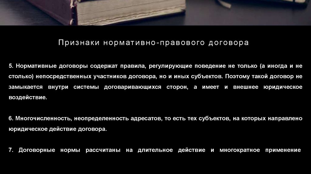 Признаки нормативно -правового договора5. Нормативные договоры содержат правила, регулирующие поведение не только (а иногда и не