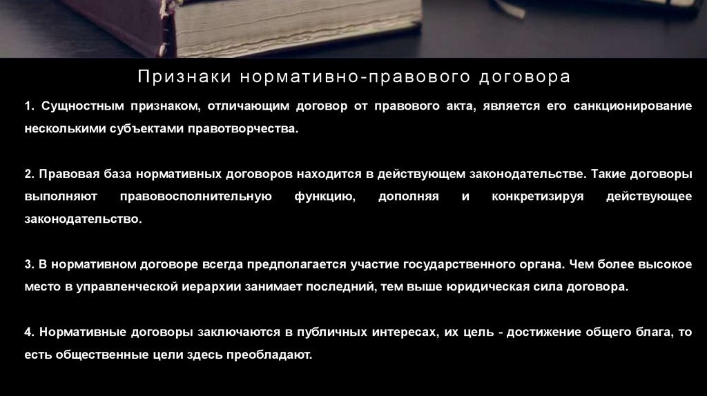 3. В нормативном договоре всегда предполагается участие государственного органа. Чем более высокое