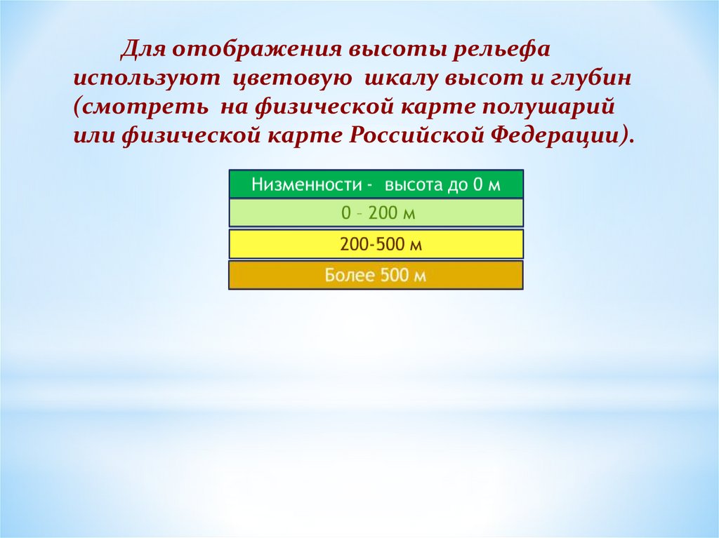 Для отображения высоты рельефаиспользуют цветовую шкалу высот и глубин