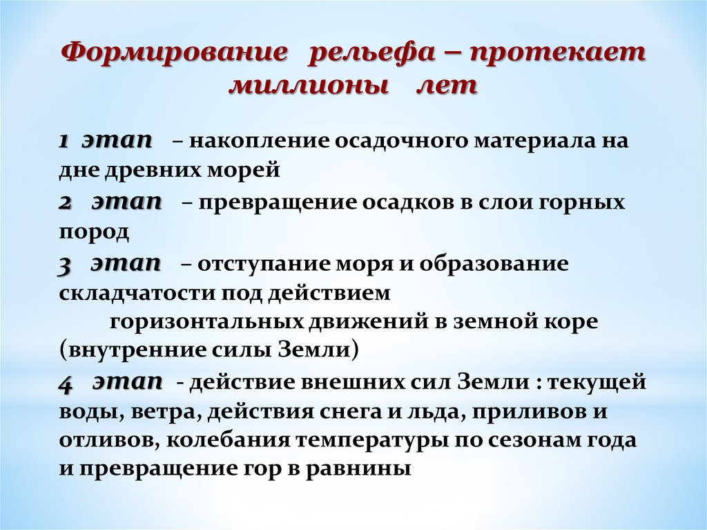 Формирование рельефа – протекаетмиллионы лет