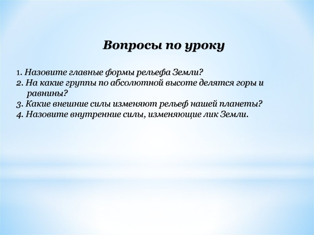Вопросы по уроку1. Назовите главные формы рельефа Земли?