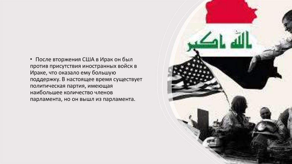 • После вторжения США в Ирак он былпротив присутствия иностранных войск в