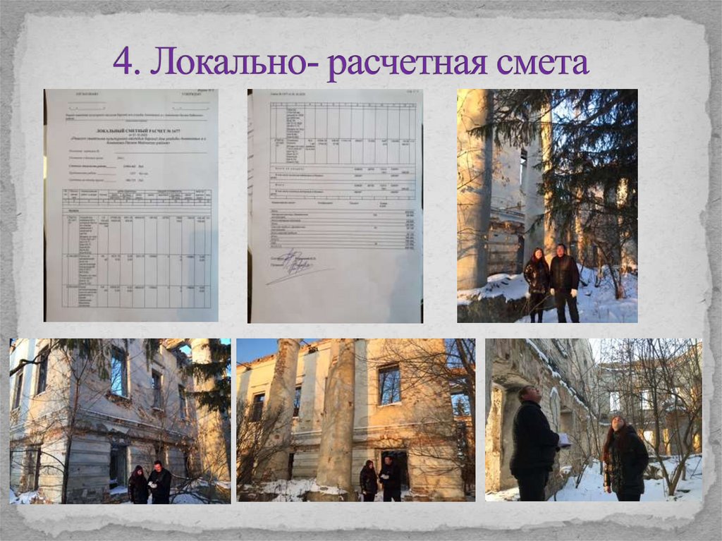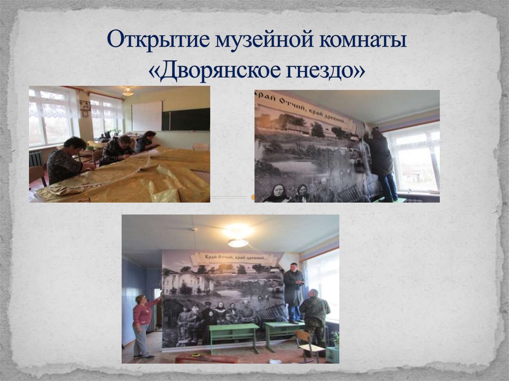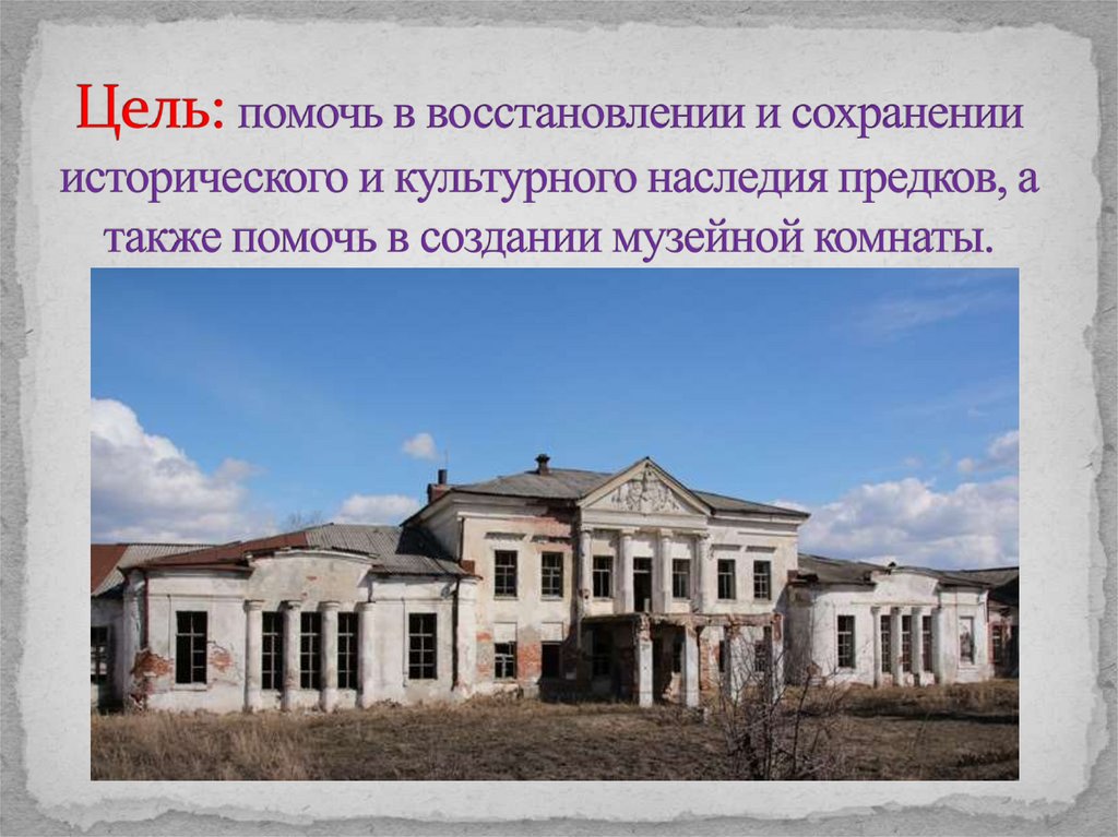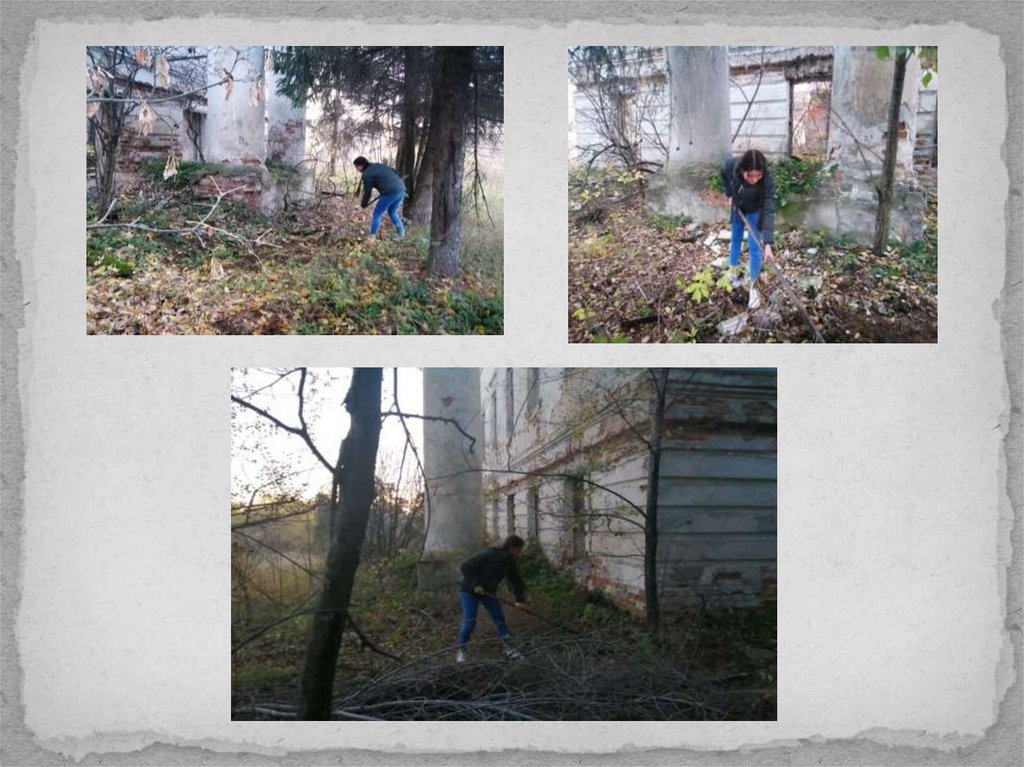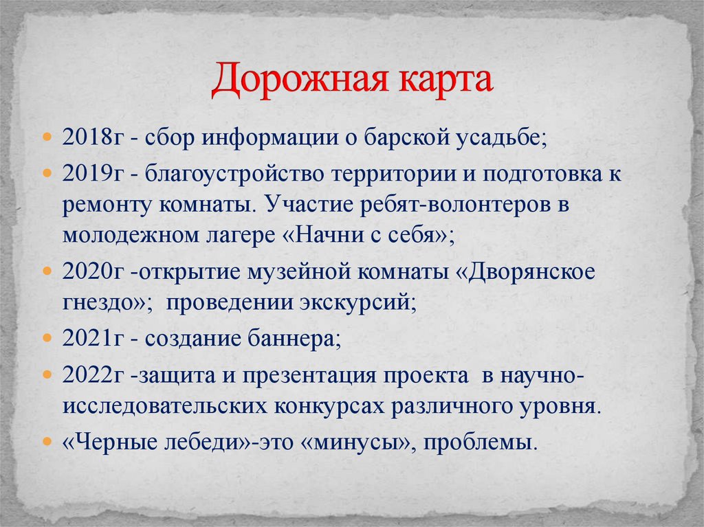 2018г - сбор информации о барской усадьбе;2019г - благоустройство территории и подготовка к