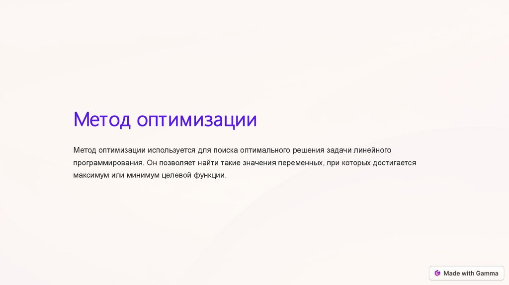 Метод оптимизацииМетод оптимизации используется для поиска оптимального решения задачи линейного