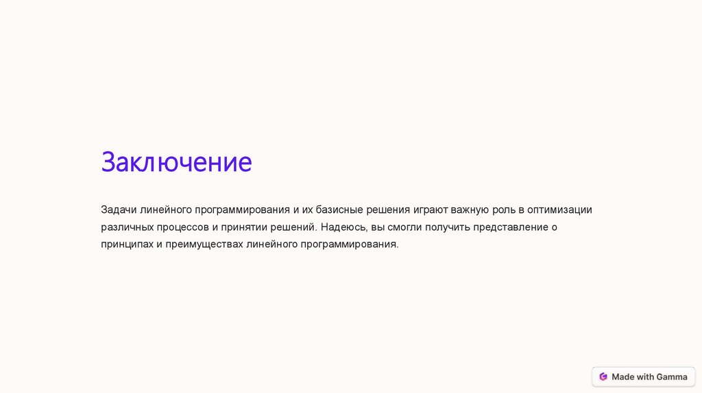 ЗаключениеЗадачи линейного программирования и их базисные решения играют важную роль в оптимизации