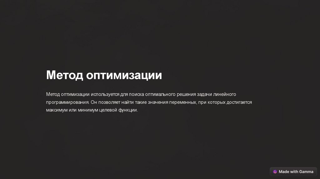 Метод оптимизацииМетод оптимизации используется для поиска оптимального решения задачи линейного