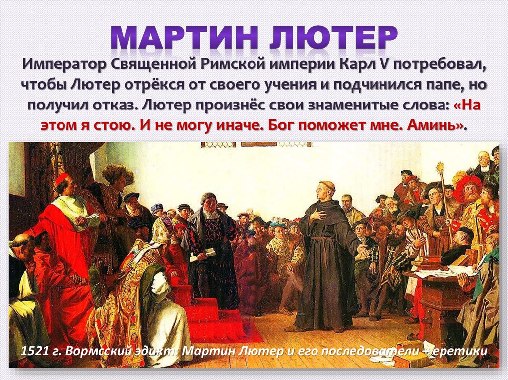 Император Священной Римской империи Карл V потребовал,чтобы Лютер отрёкся от своего учения и подчинился папе, но