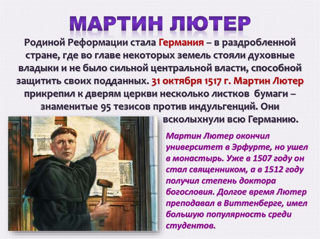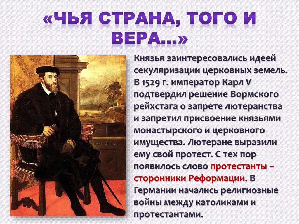 Родиной Реформации стала Германия – в раздробленнойстране, где во главе некоторых земель стояли духовные