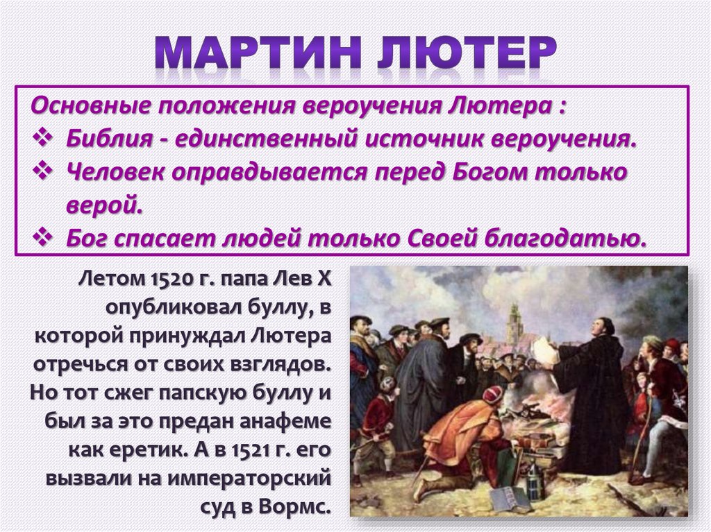 Основные положения вероучения Лютера :Библия - единственный источник вероучения.