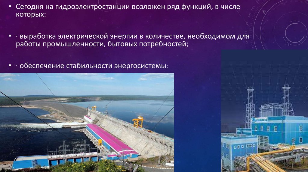 • Сегодня на гидроэлектростанции возложен ряд функций, в числекоторых: