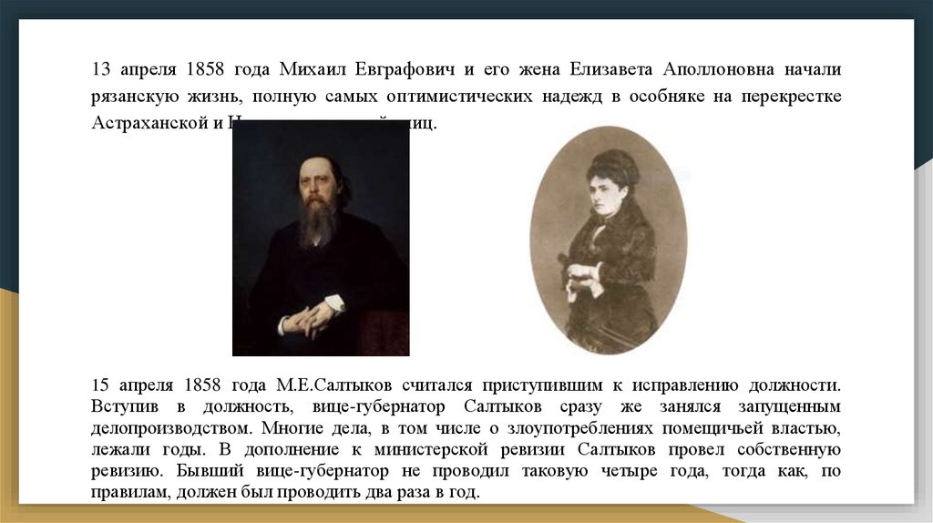 13 апреля 1858 года Михаил Евграфович и его жена Елизавета Аполлоновна началирязанскую жизнь, полную самых оптимистических надежд в особняке на перекрестке