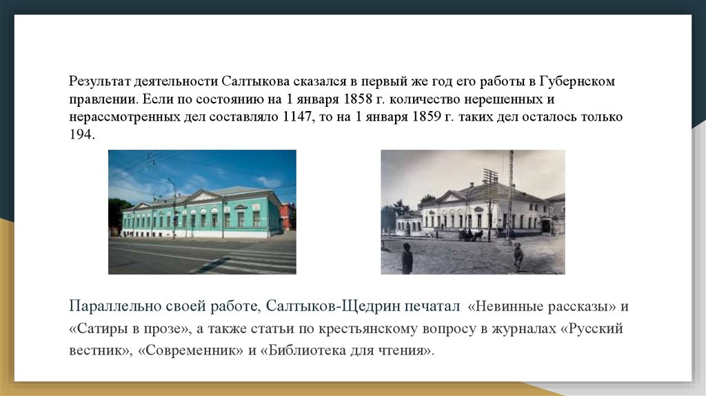 Результат деятельности Салтыкова сказался в первый же год его работы в Губернскомправлении. Если по состоянию на 1 января 1858 г. количество нерешенных и