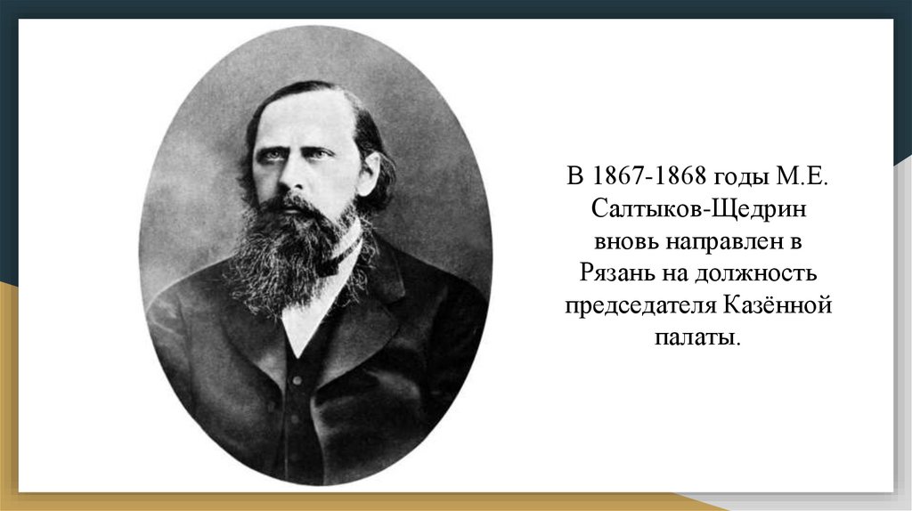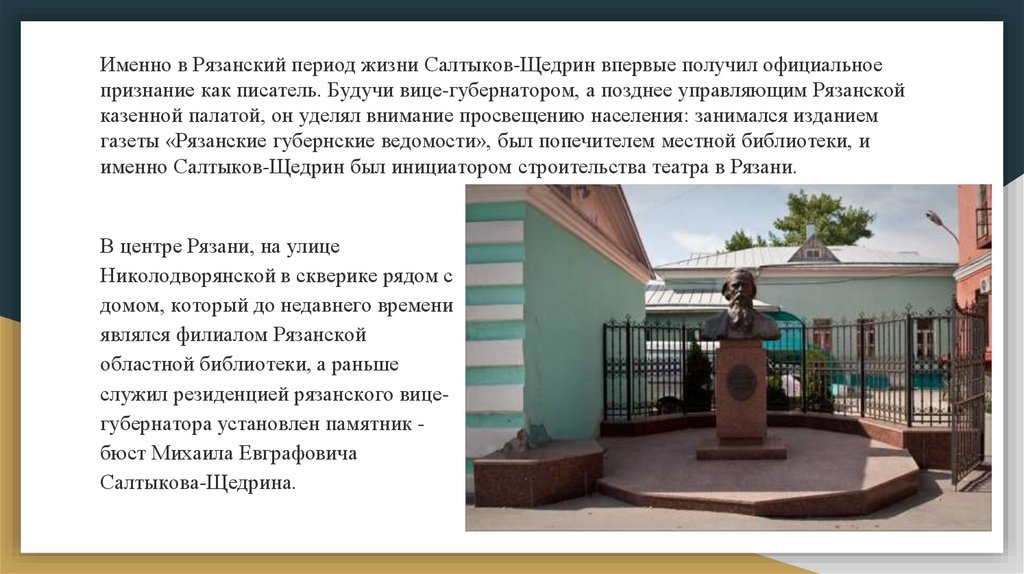 Именно в Рязанский период жизни Салтыков-Щедрин впервые получил официальноепризнание как писатель. Будучи вице-губернатором, а позднее управляющим Рязанской