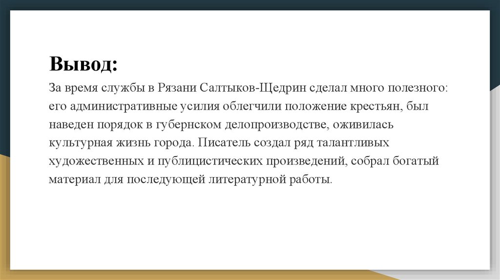 Вывод:За время службы в Рязани Салтыков-Щедрин сделал много полезного: