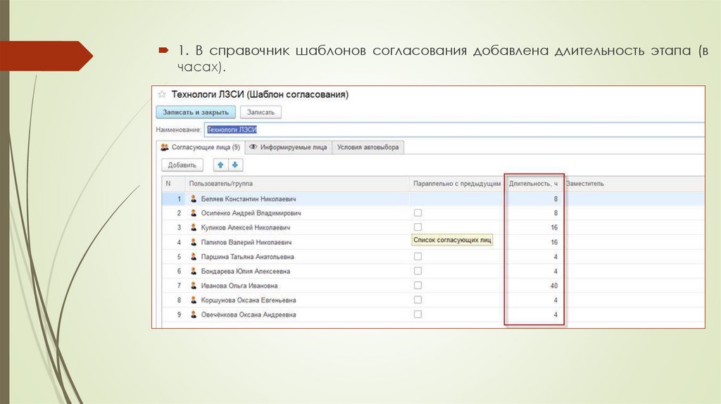 1. В справочник шаблонов согласования добавлена длительность этапа (вчасах).