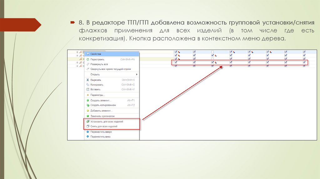 8. В редакторе ТТП/ГТП добавлена возможность групповой установки/снятияфлажков применения для всех изделий (в том числе где есть