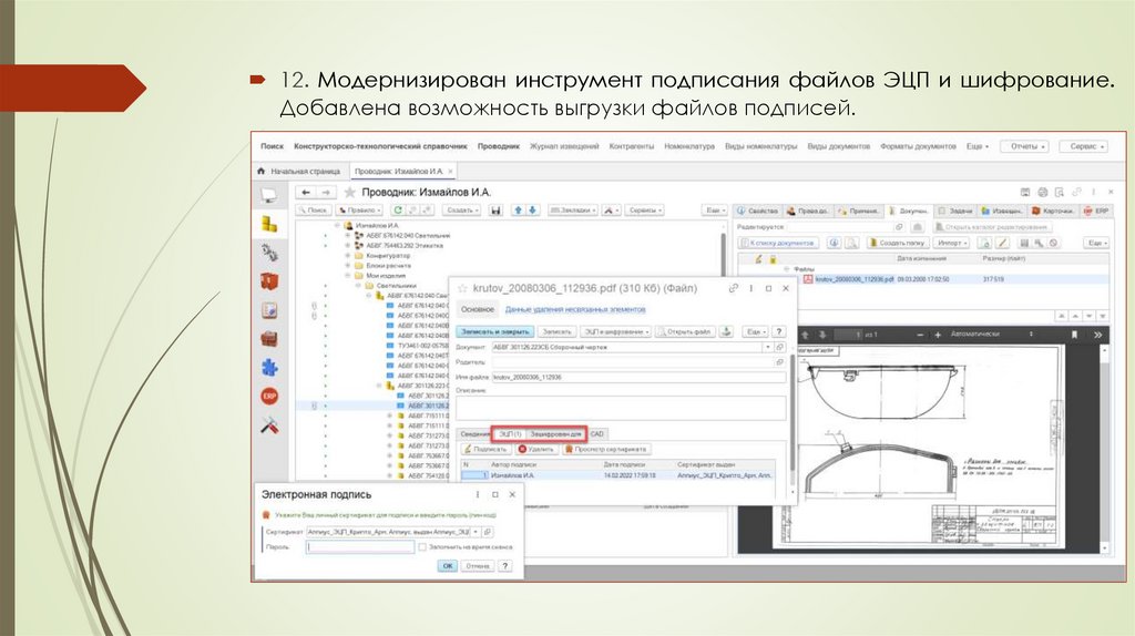12. Модернизирован инструмент подписания файлов ЭЦП и шифрование.Добавлена возможность выгрузки файлов подписей.