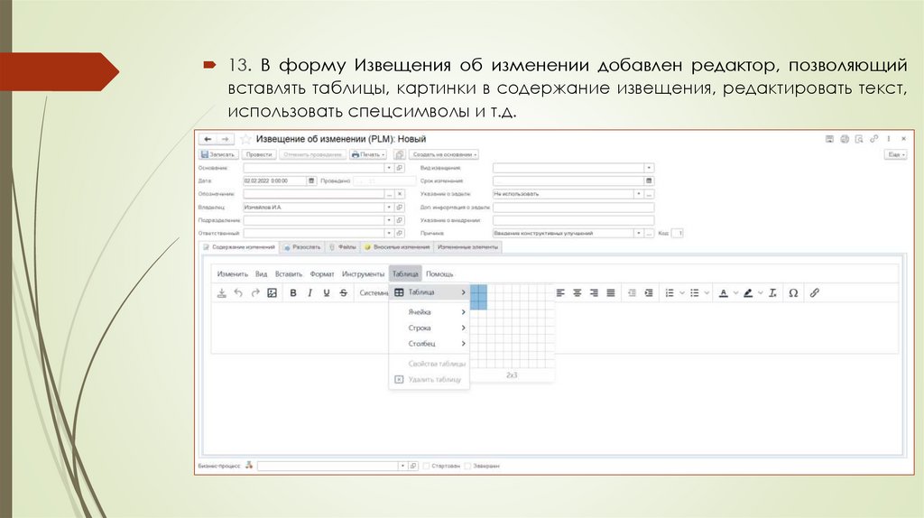 13. В форму Извещения об изменении добавлен редактор, позволяющийвставлять таблицы, картинки в содержание извещения, редактировать текст,
