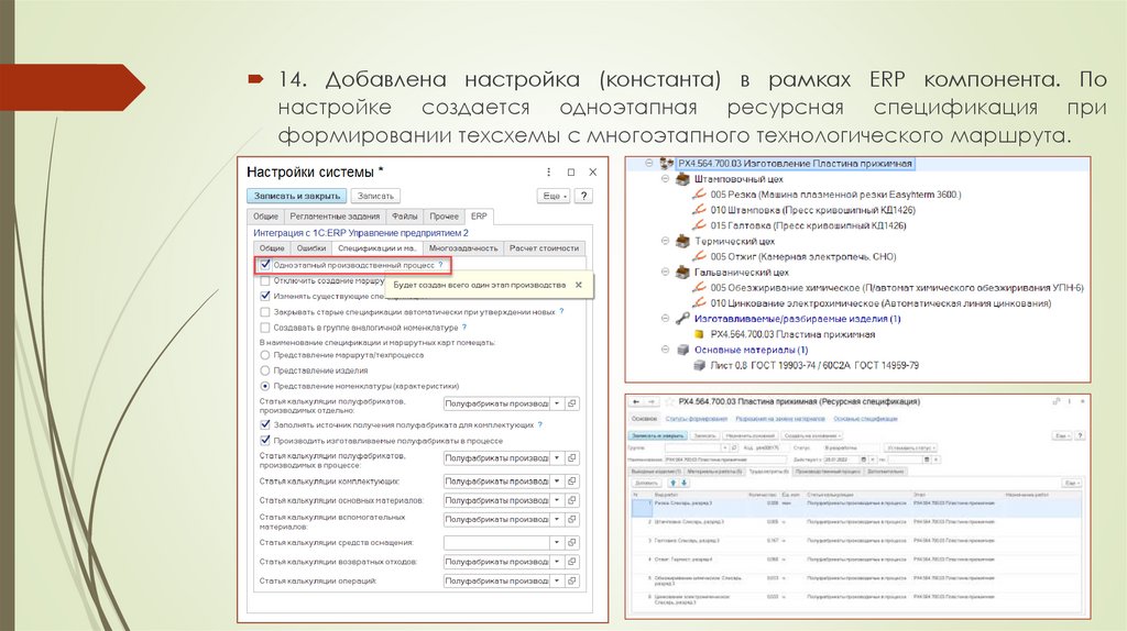 14. Добавлена настройка (константа) в рамках ERP компонента. Понастройке создается одноэтапная ресурсная спецификация при