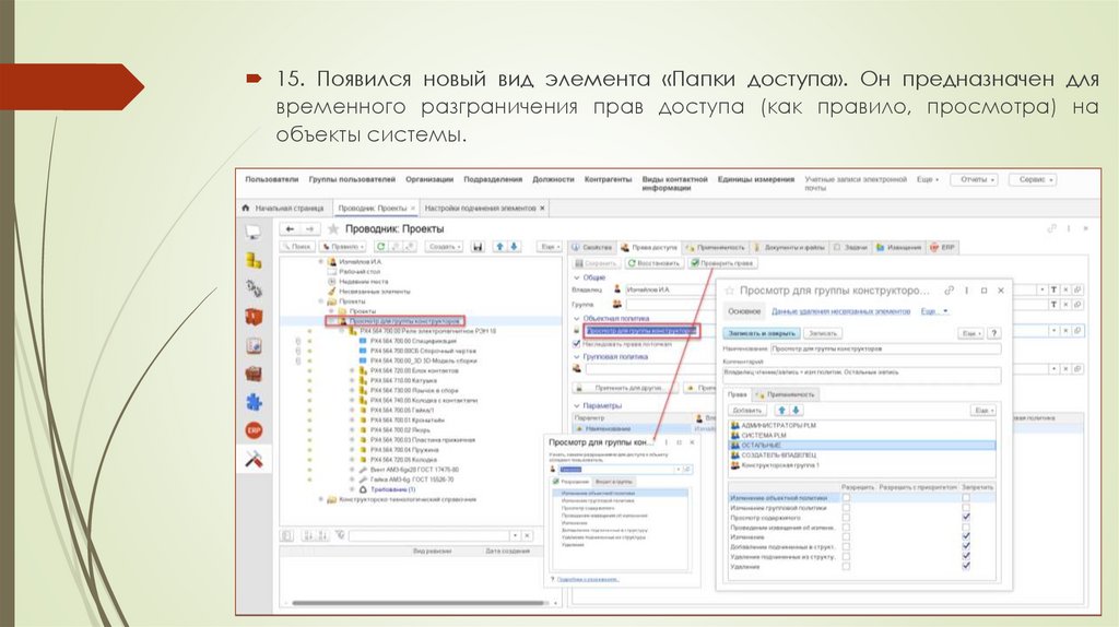 15. Появился новый вид элемента «Папки доступа». Он предназначен длявременного разграничения прав доступа (как правило, просмотра) на