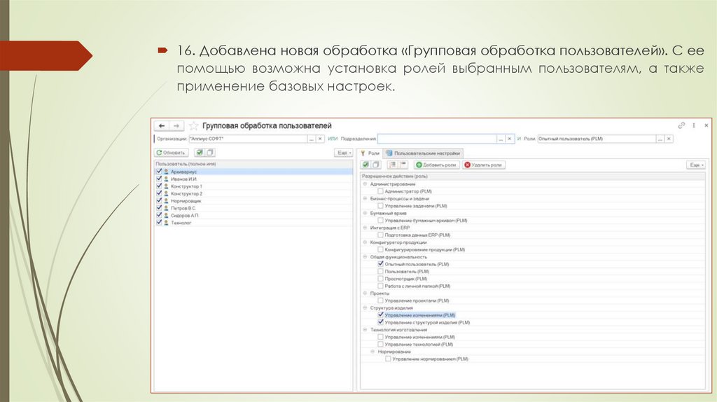 16. Добавлена новая обработка «Групповая обработка пользователей». С еепомощью возможна установка ролей выбранным пользователям, а также